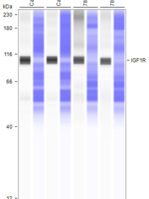 Above, you'll see a gel-like image showing protein expression of IGF1R in renal cell carcinoma following transduction with microRNA LET-7c.