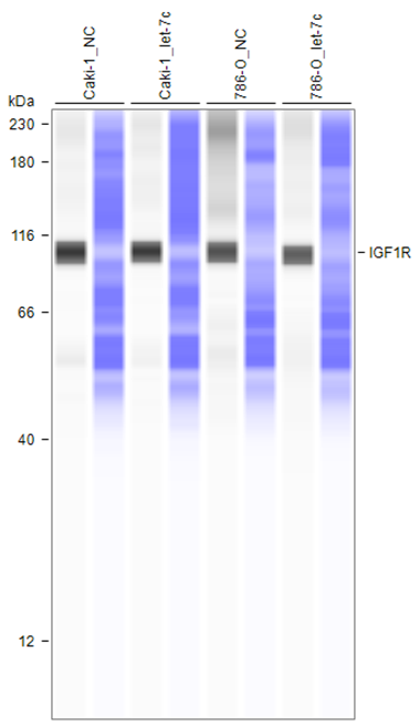 Above, you'll see a gel-like image showing protein expression of IGF1R in renal cell carcinoma following transduction with microRNA LET-7c.
